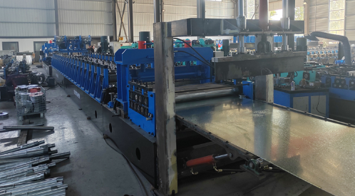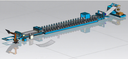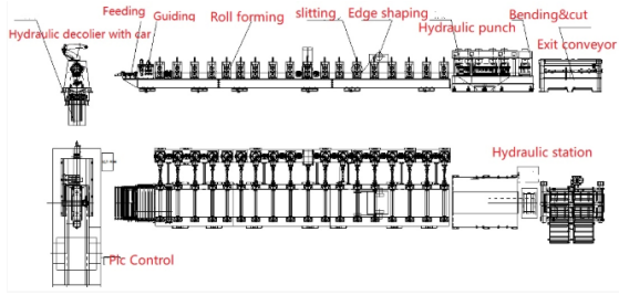 Decoiler idraulico→Alimentazione e guida→Formazione di rotoli (formazione dei bordi, taglio e avvolgimento)→Perforazione idraulica→Incurvazione→Taglio→Conduttore di uscita